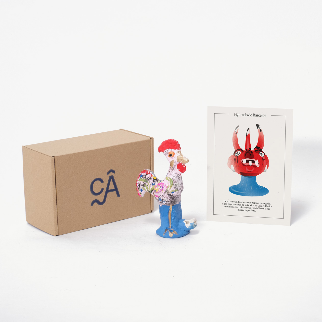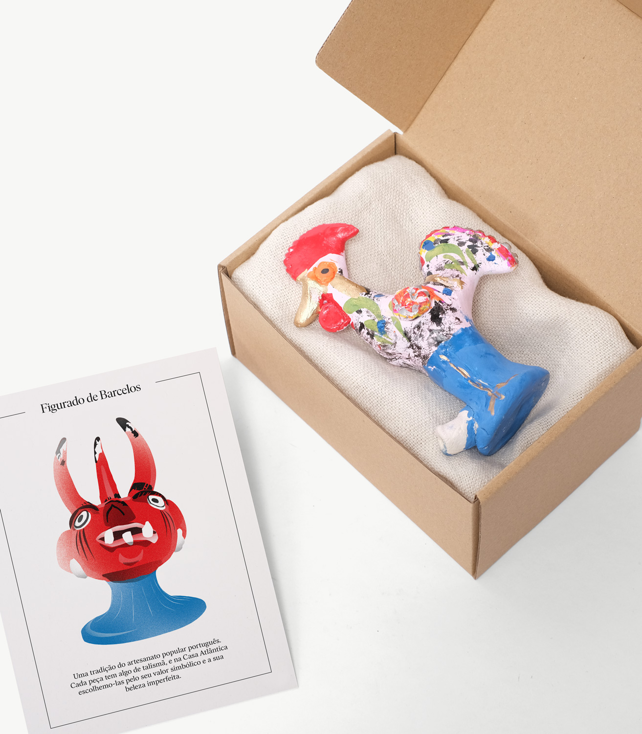 Elle comprend également une carte illustrée conçue par nos soins, avec une brève description en portugais qui rend hommage à la créativité débordante de ces figurines et à la beauté imparfaite du fait main.